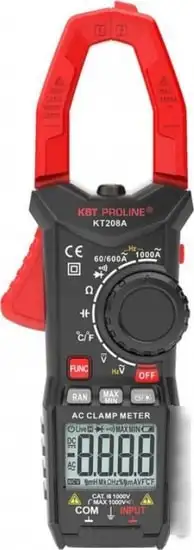 Токовые клещи КВТ KT208A — это удобный прибор для измерения переменного и постоянного тока и напряжения, сопротивления, температуры и частоты. Он оснащён ЖК-дисплеем с четырёхразрядной разрядностью и подсветкой, что облегчает чтение результатов в любых условиях. Устройство может измерять ток до 1000 А и напряжение до 750 В, а также работать с частотами до 10 000 Гц и температурой в диапазоне от -40 до +1000 °C. Благодаря автоматическому и ручному переключению пределов, измерения становятся быстрыми и точными. Токовые клещи легко использовать благодаря встроенной функции проверки диодов, прозвонки и бесконтактного определения напряжения. Также есть режим Data hold для задержки отображения результатов и автовыключение для экономии батареи.