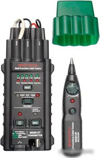 Тестер Mastech MS6813T — это удобный прибор для поисков и проверки электрических кабелей. Он работает в роли трассоискателя и содержит генератор сигнала, что помогает легко находить кабели в стенах или земле. Устройство подходит для тестирования различных кабелей, включая сетевые, телефонные и коаксиальные. Он питается от батарейки типа 6F22, которая легко заменяется. Компактный вес всего 520 г делает его удобным для использования в любой ситуации. Такой тестер подойдет для домашних и профессиональных электриков благодаря простоте и функциональности.