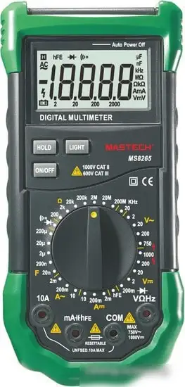 Мультиметр Mastech MS8265 — это удобный прибор для измерения различных электрических характеристик, таких как напряжение, ток, сопротивление, частота и емкость. Он оснащён ярким ЖК-дисплеем с четырёх с половиной разрядами, что помогает точно считывать результаты. Переключение режимов делается вручную, а максимум измеряемых значений — до 750 В переменного напряжения и 10 А постоянного тока. Мультиметр способен работать с частотами до 20 000 Гц и измерять сопротивление до 200 МОм. Он также проверяет диоды и осуществляет прозвонку, что удобно для диагностики. У прибора есть режим Data hold для фиксации результатов и подсветка дисплея для использования в темных условиях. Его компактный размер и вес — всего 400 г, делают его лёгким и удобным в использовании.