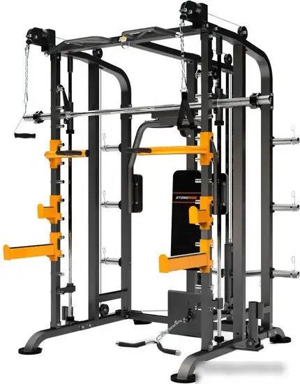 Силовая станция Stonerise D873 подходит для занятий дома и в спортзале. Она выполнена из прочной стали и имеет яркий черный и желтый цвета. В станцию входит разное оборудование, такое как турник, рама, машина Смита и механизмы для выполнения различных упражнений, включая баттерфляй и верхнюю тягу. Максимальный вес груза составляет 300 кг, что позволяет тренироваться с тяжелыми весами. Вы можете регулировать высоту ручек и штанг в 11 положениях, чтобы подобрать удобную позицию. Размеры оборудования: около 2 метров по длине и ширине, высота — почти 2,2 метра, а вес — более 211 кг. Это надежная станция для силовых тренировок дома или в спортзале.