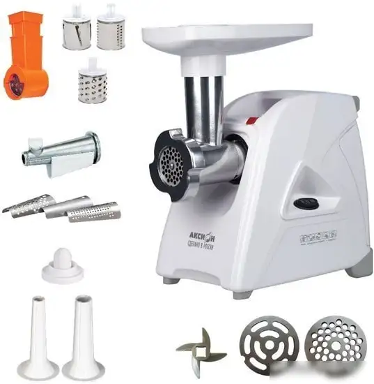Мясорубка Аксион М 35.02 — это удобный прибор для домашнего использования. Она работает от сети с мощностью 230 Вт, а при блокировке вала достигает мощности 1500 Вт, что позволяет быстро перерабатывать до 1,7 кг мяса в минуту. Корпус сделан из пластика, а цвет — белый. В комплект входят две формовочные диски с отверстиями диаметром 5 мм и овальными, насадка для кеббе и для домашней колбасы, а также универсальная соковыжималка и ломтерезка. Благодаря функции реверса, мясо не застрянет, а все аксессуары внутри корпуса легко установить и убрать. Эта мясорубка подойдет для приготовления фарша, колбас, котлет и других блюд.