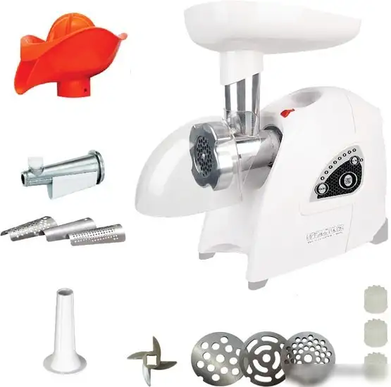 Мясорубка Аксион М42.04 обладает мощностью 1700 Вт, что позволяет перерабатывать до 2 кг мяса в минуту. Она оснащена реверсом, что помогает легко избавиться от застрявшего продукта. Корпус выполнен из прочного пластика, а устройство белого цвета легко впишется на кухне. В комплект входят два формовочных диска с отверстиями диаметром 5 мм и 7 мм, а также насадка для домашней колбасы и универсальная соковыжималка, которая пригодится для приготовления фруктовых и овощных соков.