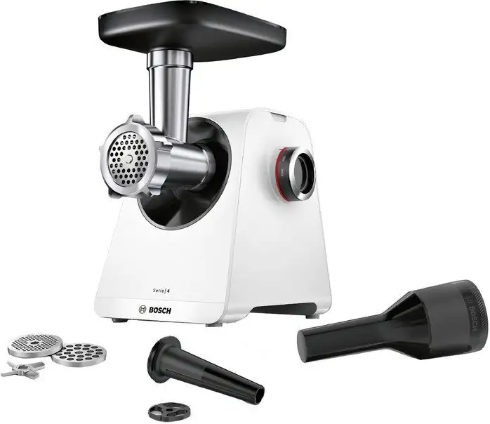 Мясорубка Bosch MFWS420W — это мощный помощник для домашней кухни. Она работает с максимальной мощностью 1 900 Вт, что позволяет быстро перерабатывать до 2,5 кг мяса в минуту. Корпус мясорубки сделан из пластика и окрашен в белый цвет, а размеры составляют примерно 20х24х25 см, вес — около 3,9 кг. Модель оснащена реверсом для удобного выхода из застрявшего мяса и включает в себя насадки и формовочные диски для разнообразных задач. В комплект входят два диска с отверстиями 3/8 мм, а также насадки для приготовления колбасы и кеббе. Такая мясорубка отлично подходит для ежедневного использования и позволяет быстро подготовить мясо для разных блюд.