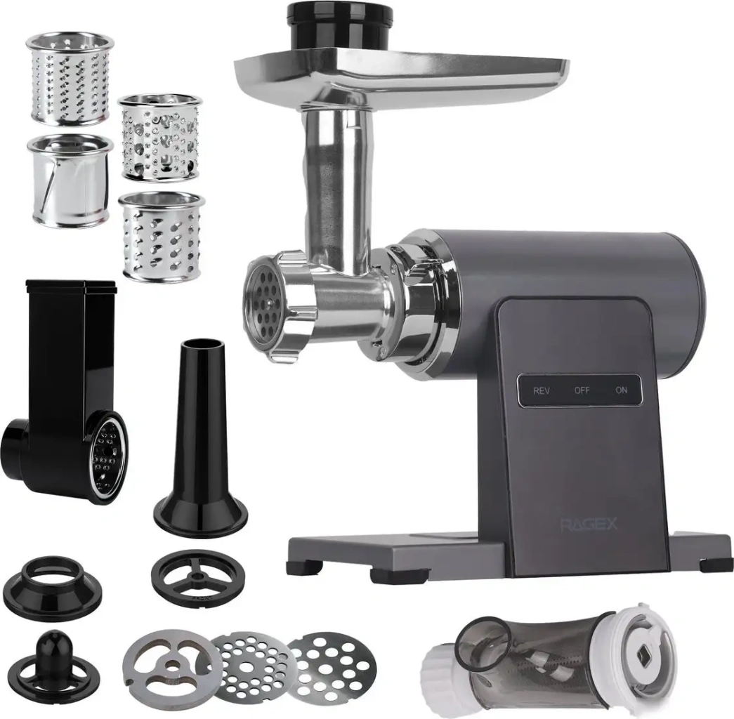 Мясорубка RAGEX R804-200 выполнена из прочного пластика и имеет серый цвет. Она успешно справляется с переработкой до 3 кг мяса в минуту благодаря мощности 450 Вт и максимальной мощности 2 400 Вт при блокировке вала. Устройство включает реверс для предотвращения застревания продукта и обеспечивает стабильную работу. В комплекте идут три формовочных диска, насадки для кеббе, домашней колбасы, терки, драников и шинковки, а также универсальная соковыжималка для различных фруктов и овощей. В набор входит загрузочный лоток, нож, толкатель и фиксирующая гайка. Мясорубка имеет компактные размеры — длина 270 мм, ширина 282 мм и высота 325 мм, а весит чуть более 5 кг. Это устройство удобно использовать благодаря многофункциональности и разнообразию насадок, что делает его идеальным помощником для домашнего приготовления.