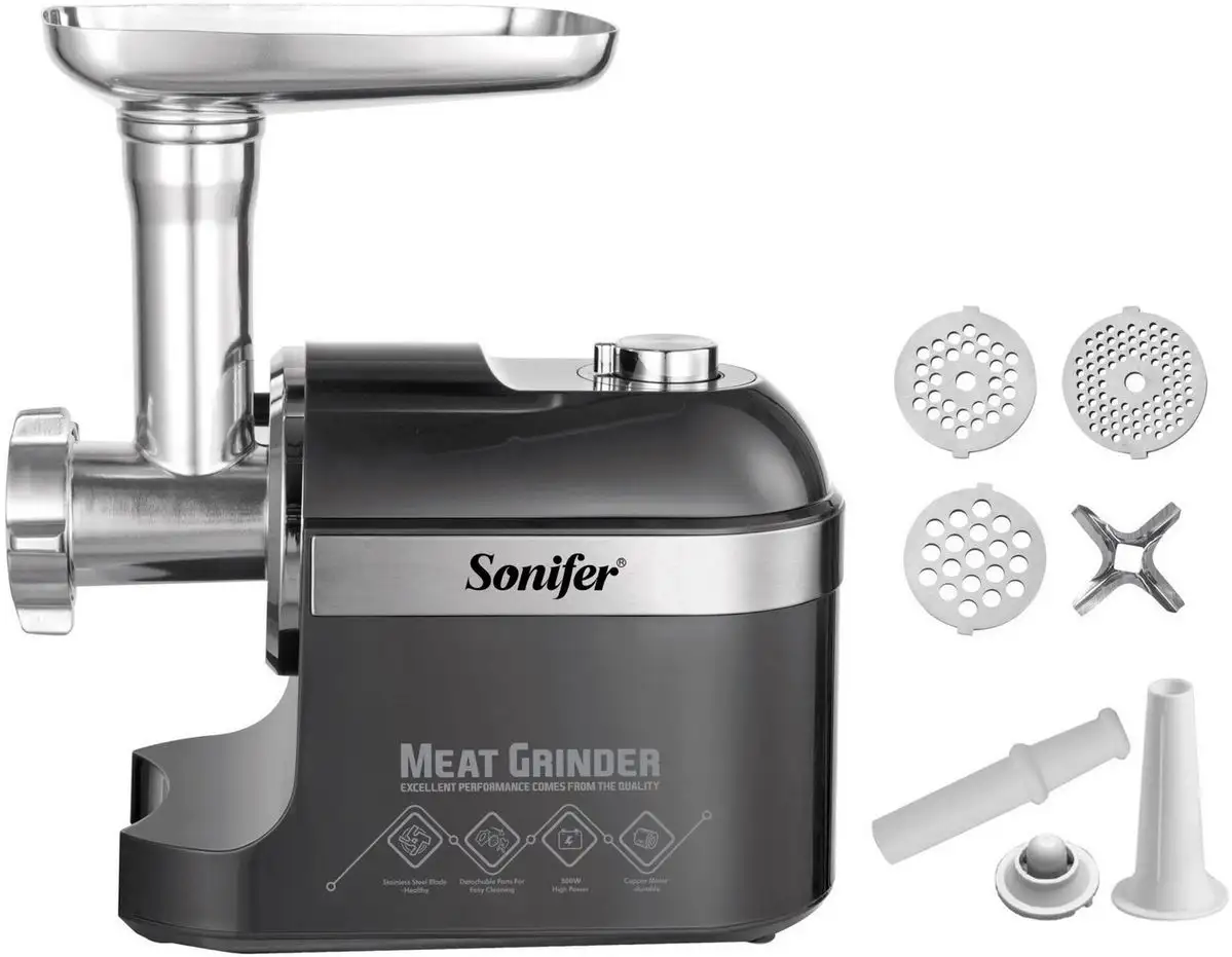 Мясорубка Sonifer SF-5030 помогает быстро и удобно измельчать мясо дома. Она достигает мощности до 800 Вт, что позволяет перерабатывать большое количество продуктов. Благодаря реверсу устройство легко очищается и предотвращает застревание мяса. Корпус сделан из металла и пластика, что обеспечивает прочность и легкость использования. Она поставляется с тремя формовочными дисками разных размеров (3, 5 и 7 мм), чтобы вы могли выбрать нужный размер измельчения. Также устройство оснащено насадками для приготовления кеббе и домашней колбасы, что поможет разнообразить блюда. Мясорубка не имеет дополнительных насадок, но включает надежный механизм для длительной работы. Металл и нержавеющая сталь делают устройство долговечным и легко чистящимся. Выполняя функции мясорубки и формовки, эта модель станет полезной в любой кухне.