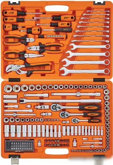 Этот набор домашнего мастера Affix AF01174C содержит 174 предмета, которые понадобятся для ремонта и обслуживания дома. В комплект входят разные виды головок: торцевые, глубокие и Е-тип, а также трещотки и воротки для удобной работы в труднодоступных местах. Есть удлинители и комбинированные ключи, что помогает справляться с разными задачами. В наборе также есть отвертки, биты и пассатижи для более точной работы.