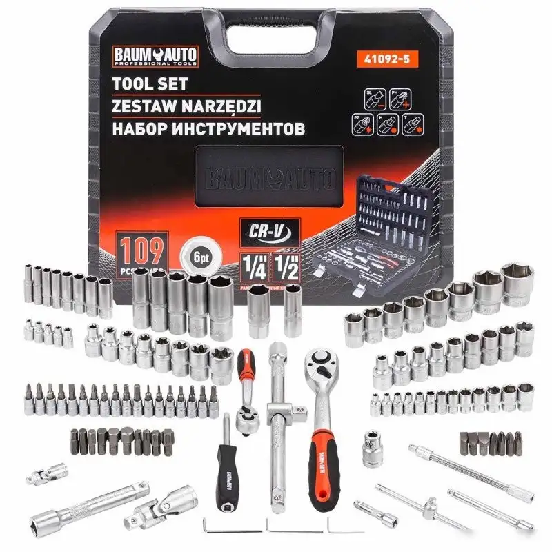 Этот универсальный набор инструментов BaumAuto BM-41092-5(58799) включает все необходимые инструменты для ремонта и обслуживания. В набор входят две трещотки, ключи гаечные, рукоятка, кейс для хранения и различные головки — всего 76 штук, чтобы подобрать нужный размер для любой задачи. В комплекте есть как стандартные, так и глубокие торцевые головки разных размеров, что облегчает работу в труднодоступных местах. Также есть шестигранные отверточные биты, удлинители и кардан, что повышает удобство использования. Основные функции набора позволяют быстро и точно выполнять сборочные и ремонтные работы. Все инструменты выполнены в черном цвете и упакованы в удобный кейс, что делает их переноску и хранение простым. Эта комплектация подойдет как для профессионалов, так и для домашнего мастера.