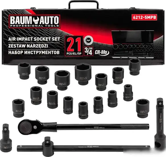Универсальный набор инструментов BaumAuto BM-6212-5MPB включает 21 предмет, которые подойдут для различных ремонтных работ. Он содержит ударные и торцевые головки диаметром от 17 до 50 мм, что позволяет работать с разными деталями. В набор входит трещотка и T-образный вороток для удобства использования в труднодоступных местах. Также есть два удлинителя, чтобы увеличить диапазон работы. Все головки имеют посадочный размер 3/4, что обеспечивает совместимость с большинством инструментов. Такой комплект отлично подходит для автомобильных и домашних задач. Он облегчает выполнение регулярных и сложных ремонтов. Все элементы сделаны из прочных материалов для долговечности и надежности. Этот набор помогает выполнять работу быстро и качественно, объединяя все необходимые инструменты в одном комплекте.