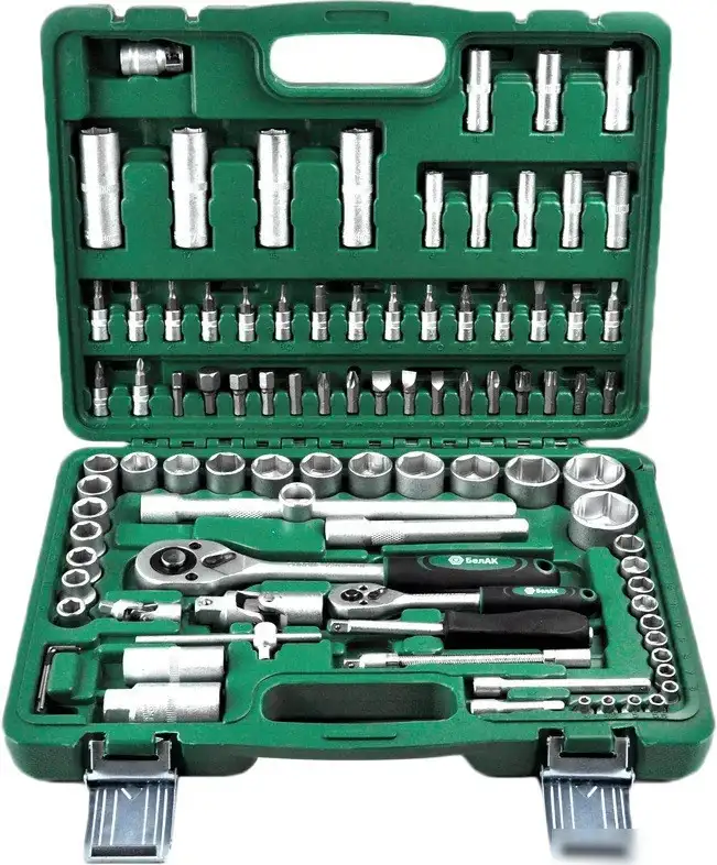 Этот набор включает 94 предмета и предназначен для выполнения различных работ с помощью трещотки и разнообразных головок и бит. Он содержит торцевые и глубокие головки как для 1/4", так и для 1/2" квадрата, что позволяет работать с разными крепежами. В комплект входят различных типов биты: Тогх, Phillips, Pozidrive, HEX, прямой шлиц и свечные головки, что расширяет возможности для поиска нужных инструментов. Также в наборе есть удлинители, кардан-шарнир, переходники и угловые ключи, что облегчает доступ к труднодоступным местам. Трещотки и вороток обеспечивают удобство при закручивании и выкручивании. Особенность комплекта — наличие гибкого удлинителя и карты для быстрого переключения инструментов. Всё аккуратно укладывается и удобно хранится в специальной коробке, что делает использование максимально простым и быстрым.
