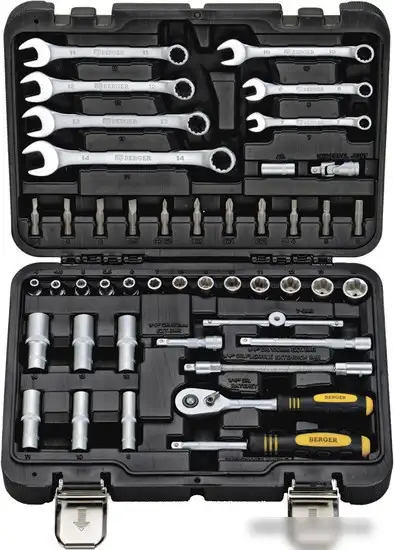 Этот универсальный набор инструментов Berger BG045-14 включает 45 предметов, которые пригодятся для ремонта и обслуживания дома или автомобиля. В наборе есть разнообразные торцевые головки и ключи разных размеров, что позволяет работать с разными крепежами. Предметы легко и быстро меняются благодаря трещотке с быстрым сбросом и гибкому удлинителю, что делает работу удобной даже в труднодоступных местах. В комплект входит и отвертка с присоединением под биты, их 11 штук — для различных задач. Удобный Т-образный вороток и кардан позволяют регулировать положение инструментов для более точной работы. Все детали аккуратно упакованы и компактно хранятся, что обеспечивает удобство и быстрое нахождение нужного инструмента.