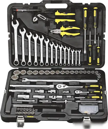 Этот универсальный набор инструментов Berger BG102-1214 включает 102 предмета, которые понадобятся для многих ремонтных работ и сборки. В комплект входит широкий выбор торцевых головок диаметром 1/4" и 1/2", а также трещотки с быстрым сбросом, позволяющие быстро менять насадки. В наборе есть отвертки с присоединительными квадратами, а также разнообразные биты — крестовые, звёздочные, шлицовые и шестигранные — что обеспечивает универсальность и удобство. Для работы с болтами и винтами используй ключи и пассатижи, а молоток поможет забить гвозди или аккуратно разбивать материал. В комплекте есть удлинители, карданные шарниры и адаптеры, что облегчает доступ к труднодоступным местам. Также предусмотрены головки свечные и магнитные, что подходит для автомастерских. Такой набор удобно держать в гараже или мастерской — всё необходимое инструменты всегда под рукой. Благодаря качественным материалам весь комплект долговечен и надежен при использовании.