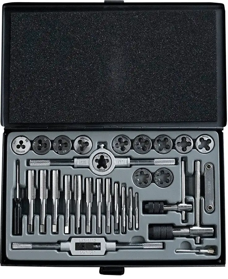Набор метчиков Berger BG31TDS включает 31 предмет, который пригодится для нарезания резьбы в металле. В комплект входят различные метчики и плашки для работы с резьбами M3 до M12, а также однопроходные метчики для ускорения процесса. В набор входит два типа ключей: обычный для метчиков M3–M12 и быстрозажимной Т-образный для метчиков M3–M6 и M5–M12, что облегчает их закрепление. Также в комплекте есть резьбомер для точного определения диаметра резьбы и щетка для очистки инструментов. Метчики и плашки изготовлены из прочного материала, что обеспечивает долговечность и надежность при работе. Использование набора помогает легко нарезать, очищать и проверять резьбу без лишних затрат времени. Этот набор идеально подходит для ремонта и изготовления резьбовых соединений. Он удобен в использовании и подходит как для ремонта, так и для промышленного применения. Все инструменты собраны в компактную комплектацию, которая легко поместится в ящик с инструментами.