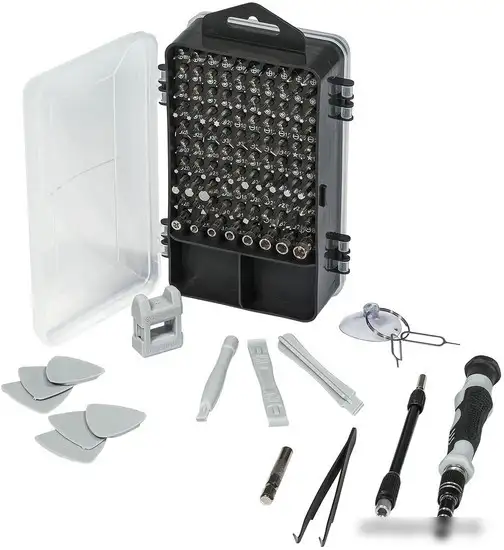 | Комплектация | - Отвертка-держатель для бит (1 шт) - Гибкий вал (1 шт) - Держатель для бит (1 шт) - Пинцет (1 шт) - Лопатка (3 шт) - Ключ для SIM карты (2 шт) - Магнит (1 шт) - Присоска (1 шт) - Медиатор (6 шт) - Биты 25 мм (98 шт) - Удлинитель для бит (1 шт) - Кейс (1 шт) |