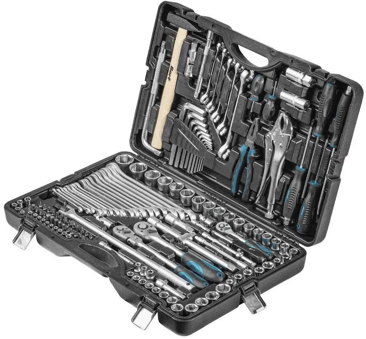 Этот универсальный набор инструментов Bort BTK-142 состоит из 142 предметов, которые пригодятся при ремонте и обслуживании дома или автомобиля. В набор входит множество головок, трещоток, ключей и отверток разных размеров, что позволяет выполнять самые разные работы. В комплекте есть торцевые головки как с квадратным, так и с Е-образным креплением, а также удлинители и гибкий удлинитель для труднодоступных мест. Особенно удобно наличие головок свечных, комбинированных и угловых ключей, которые расширяют возможности работы. Для фиксации и захвата есть пассатижи и молоток с деревянной ручкой.
