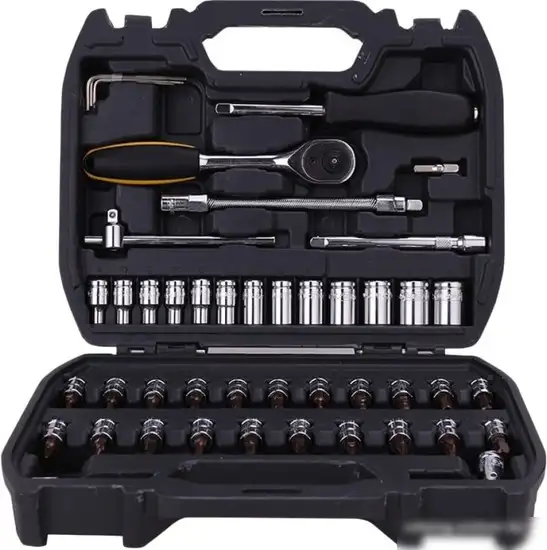 Этот набор включает трещотку с головками и битами, предназначен для разных ремонтных работ. В комплект входит 46 предметов, включая ключи, головки и биты для отвёрток. Вы можете легко добраться до труднодоступных мест благодаря шарнирным и удлинительным стержням. В наборе есть универсальный кардан и скользящий стержень, что облегчает работу под разными углами. Присутствуют различные шестигранные ключи и торцевые насадки, которые подходят для разных винтовых головок. Трещотка обеспечивает стабильное вращение и удобное усилие при закручивании. Биты позволяют быстро менять насадки без лишних усилий. Такой комплект подходит для домашних и профессиональных задач, он делает ремонт быстрым и удобным.
