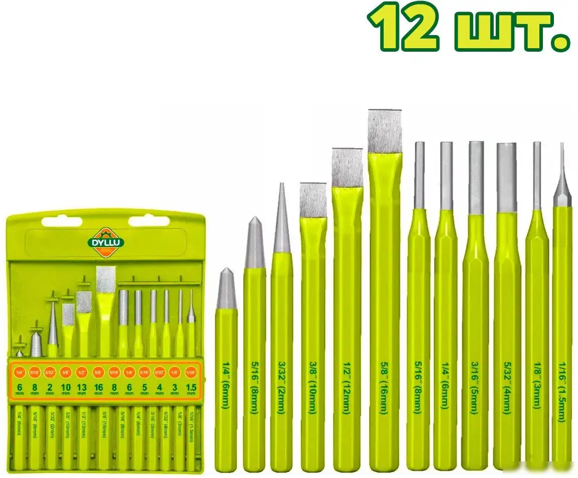 Этот набор зубил Dyllu DTCC8312 включает 12 предметов, которые пригодятся при работе с различными материалами. В комплект входят выколотки разного размера, зубила, бородок и керны, что позволяет выполнять широкий спектр задач. Выколотки имеют диаметры 1,5 мм, 3 мм, 4 мм, 5 мм, 6 мм и 8 мм, а зубила – длиной 10 мм, 12 мм и 16 мм. Длина инструментов варьируется от 115 до 172 мм, что обеспечивает удобство и точность работы. Все предметы сделаны из прочного металла, что гарантирует долговечность и надежность. Этот набор идеально подходит для профессиональных и домашних работ.