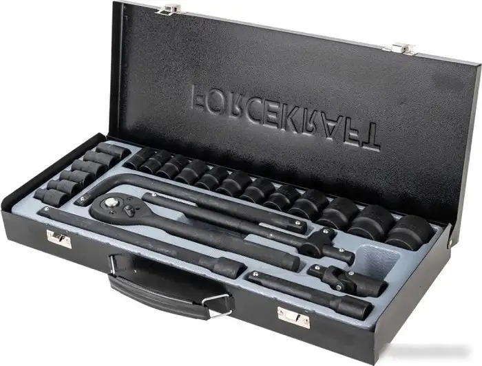 | Комплектация | Торцевые головки 1/2? (8, 9, 10, 12–22, 24, 27, 30, 32 мм) Удлинители 1/2? (125, 250 мм) Кардан 1/2? Ключи Ключи вороток (1 шт.) Воротки Г-образный (250 мм) |