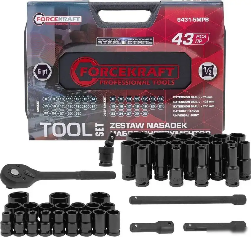 Универсальный набор инструментов ForceKraft FK-6431-5MPB включает 43 предмета, упакованных в удобный кейс черного цвета. Он содержит 25 торцевых головок на 1/2" и 1/2" шестигранных головок, которые подходят для различных задач. В набор также входит трещотка с фиксацией, удлинители на 1/2" и кардан для облегчения работы в труднодоступных местах. Благодаря разнообразию крепежных элементов, вы сможете выполнить большинство ремонтных работ дома или в гараже. В комплект входит прочная трещотка для надежного захвата и фиксации ключей. Удлинители помогают расширить диапазон работы с болтами и гаечными ключами. Все инструменты выполнены из прочных материалов, что обеспечивает долговечность и надежность. В таком наборе легко найти все необходимые инструменты для бытовых и профессиональных задач. Этот набор компактно упакован в кейс, его легко брать с собой и хранить. Благодаря всем этим функциям, набор ForceKraft станет надежным помощником для любителя и профессионала.