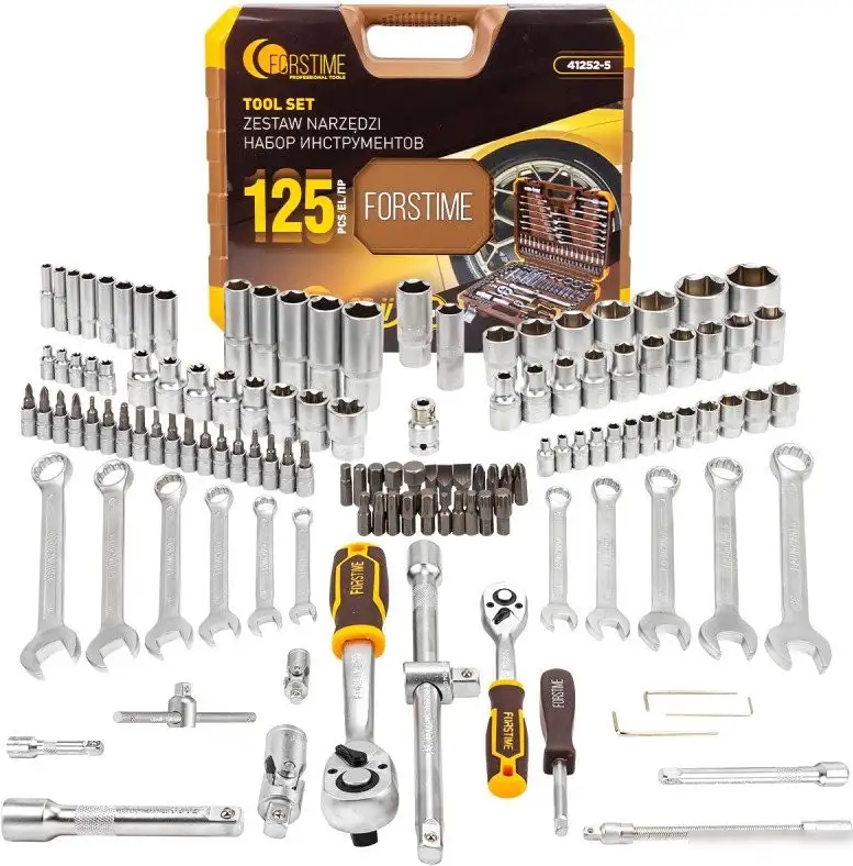 Этот универсальный набор инструментов Forstime FT-41252-5(58795) включает все необходимое для ремонта и обслуживания. В комплект входят полноразмерные головки с посадочным размером 1/4" и 1/2", а также глубокие и Е-тип головки для удобства работы в труднодоступных местах. В наборе есть реверсивная трещотка, карданный шарнир и удлинители, что помогает выполнять работу даже в узких пространствах. Вам также доступны биты TORX, SLOTTED, PHILLIPS и POZIDRIV, которые подходят для разных типов винтов и болтов. В комплект входят ключи различных размеров, битодержатель и два трещоточных ключа для разной работы. Всё аккуратно упаковано в прочный металлический кейс, что облегчает хранение и транспортировку. Этот набор подходит как для специалистов, так и для домашнего мастера.