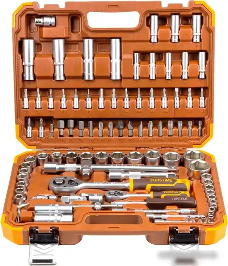 Универсальный набор инструментов Forstime FT-4821-5 состоит из 82 предметов, что позволяет выполнять большинство ремонтных и монтажных работ. В комплект входят разные головки, насадки-биты, удлинители и кардан для удобства работы в труднодоступных местах. Есть как торцевые головки разных размеров, так и отвертки и трещотки для разных типов крепежа. Среди функций есть возможность использования головок со вставками, крестовых, шестигранных и звездочек, что расширяет варианты работы.