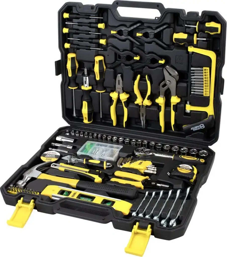 Этот набор домашних инструментов Грандмастер 671336 содержит 168 предметов, которые понадобятся для ремонта дома и мелких работ. В комплект входят различная отвертка, трещотка, ключи, молоток, ножовка и плоскогубцы — всё, что нужно для монтажа и ремонта. Вы найдете широкий выбор головок, насадок и удлинителей, что облегчает работу в труднодоступных местах. В набор включены уровень и рулетка для точных измерений, а также кейс для удобного хранения и транспортировки инструментов. Дополнительная комплектация помогает справляться с разными задачами быстро и удобно. Инструменты сделаны из прочных материалов и подходят для длительного использования. Разнообразие ключей и насадок обеспечивает универсальность набора для домашних и профессиональных работ.