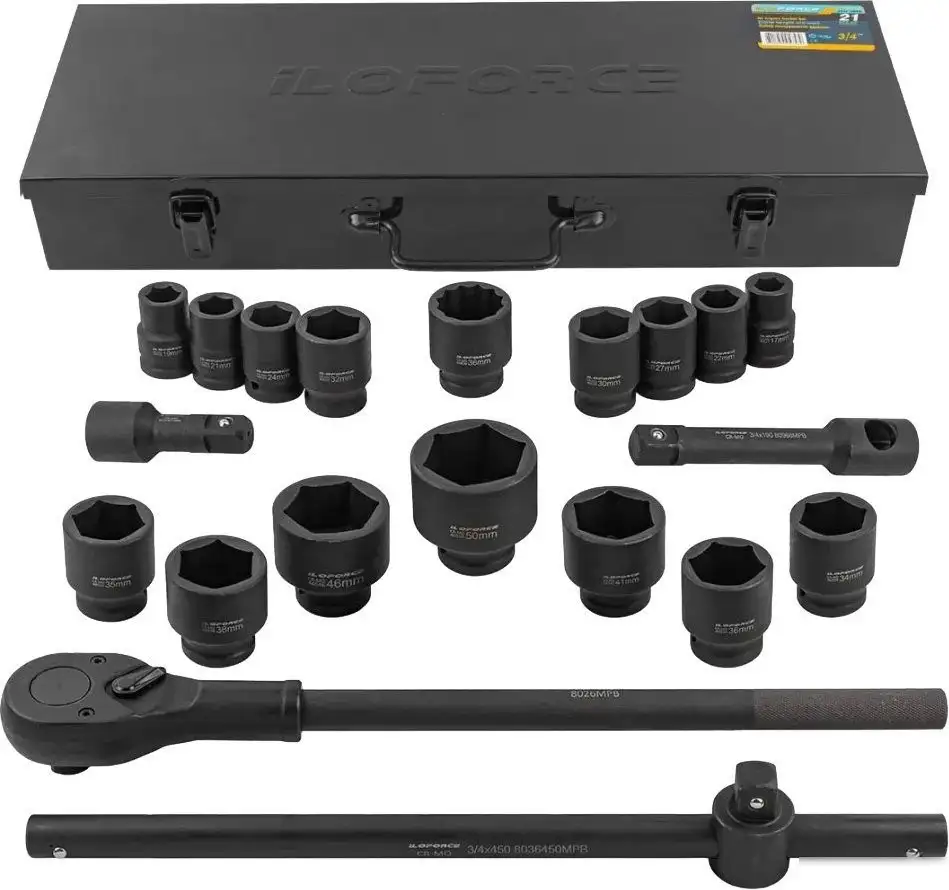 | Комплектация | головки ударные 6-гранные 3/4":17-19-21-22-24-27-30-32-33-34-35-36(12-гран.)-38-41-46-50 мм; трещотка 3/4"450 мм; удлинитель ударный под вороток 3/4""200мм; удлинитель ударный 3/4""100мм; вороток Т-образный 3/4""450 мм; кейс |