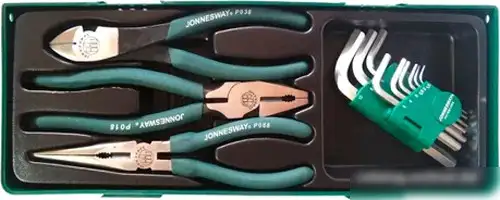 Этот набор пассатижей Jonnesway P018SP1 включает 12 предметов разных размеров и функций, что позволяет выполнять широкий спектр работ. В комплект входят классические пассатижи для захвата и держания предметов, бокорезы для резки проводов и угловые ключи для работы с шестигранными болтами. Все инструменты выполнены в ярких зеленых и черных цветах, что облегчает их поиск в ящике. Каждый инструмент удобно держать в руке благодаря эргономичной конструкции. В набор не входят диэлектрические пассатижи, что увеличивает их универсальность. Угловые ключи позволяют работать в труднодоступных местах. Бокорезы обеспечивают точную резку и долговечность. Такой комплект подойдет для ремонта, обслуживания и домашних проектов.