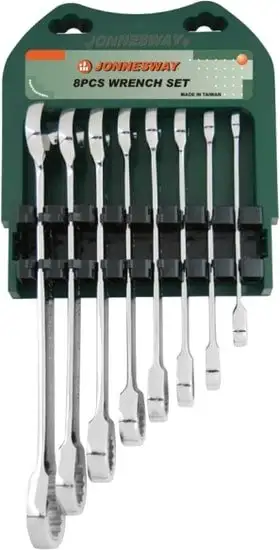 Этот набор ключей Jonnesway W45308S включает в себя восемь комбинированных ключей с трещоткой, размером от 8 до 19 мм. Они идеально подходят для разных задач по ремонту и обслуживанию, позволяя быстро и легко закручивать или откручивать болты. Каждый ключ выполнен из прочного металла, что обеспечивает долговечность и надежность. Такой набор удобно хранить и брать с собой в работу или в автопутешествие. Он хорошо подходит для домашнего использования, ремонта автомобиля или бытовых задач.