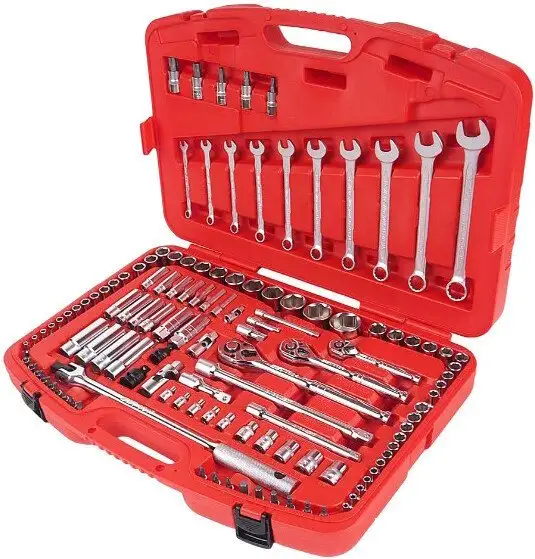 | Комплектация | Оснастка головки (95 шт.), удлинители (6 шт.), кардан (3 шт.), адаптер (2 шт.) Головки торцевые (35 шт.), глубокие торцевые (15 шт.), торцевые Е-тип (10 шт.), головки со вставкой (23 шт.), торцевые дюймовые (12 шт.) Торцевые головки 1/2" (14, 15, 16, 17, 18, 19, 21, 22, 23, 24, 27, 30, 32 мм), 3/8" (8, 9, 10, 11, 12, 13, 14, 15, 16, 17 мм), 1/4" (4, 4.5, 5, 5.5, 6, 7, 8, 9, 10, 11, 12, 13 мм) Глубокие торцевые головки 1/2? (14, 17, 19, 21 мм), 3/8? (10, 12, 13, 14 мм), 1/4? (6, 7, 8, 9, 10, 11, 12 мм) Торцевые головки E-тип 3/8? (Е10, Е12, Е14, Е16, Е18), 1/4? (Е4, Е5, Е6, Е7, Е8) Торцевые дюймовые головки 1/4? (5/32", 3/16", 7/32", 1/4", 9/32", 5/16", 11/32", 3/8", 13/32", 7) Головки со вставкой шлицевые (SL) (SL4, SL5.5, SL6.5), крестовые (PH) (PН1, PН2, PН3), шестигранные (Hex) (Н3, Н4, Н5, Н6, Н7, Н8), звездочкой (Torx) (Т10, Т15, Т20, Т25, Т27, Т30, Т40, Т45, Т50, Т55, Т60) Удлинители 1/2? (3", 10"), 3/8? (1-3/4", 6"), 1/4? (2", 4") Кардан 1/2?, 3/8?, 1/4? Ключи Ключи вороток (1 шт.), комбинированный (10 шт.) Воротки шарнирный Размер ключа 8 мм, 10 мм, 11 мм, 12 мм, 13 мм, 14 мм, 15 мм, 17 мм, 19 мм, 9 мм |