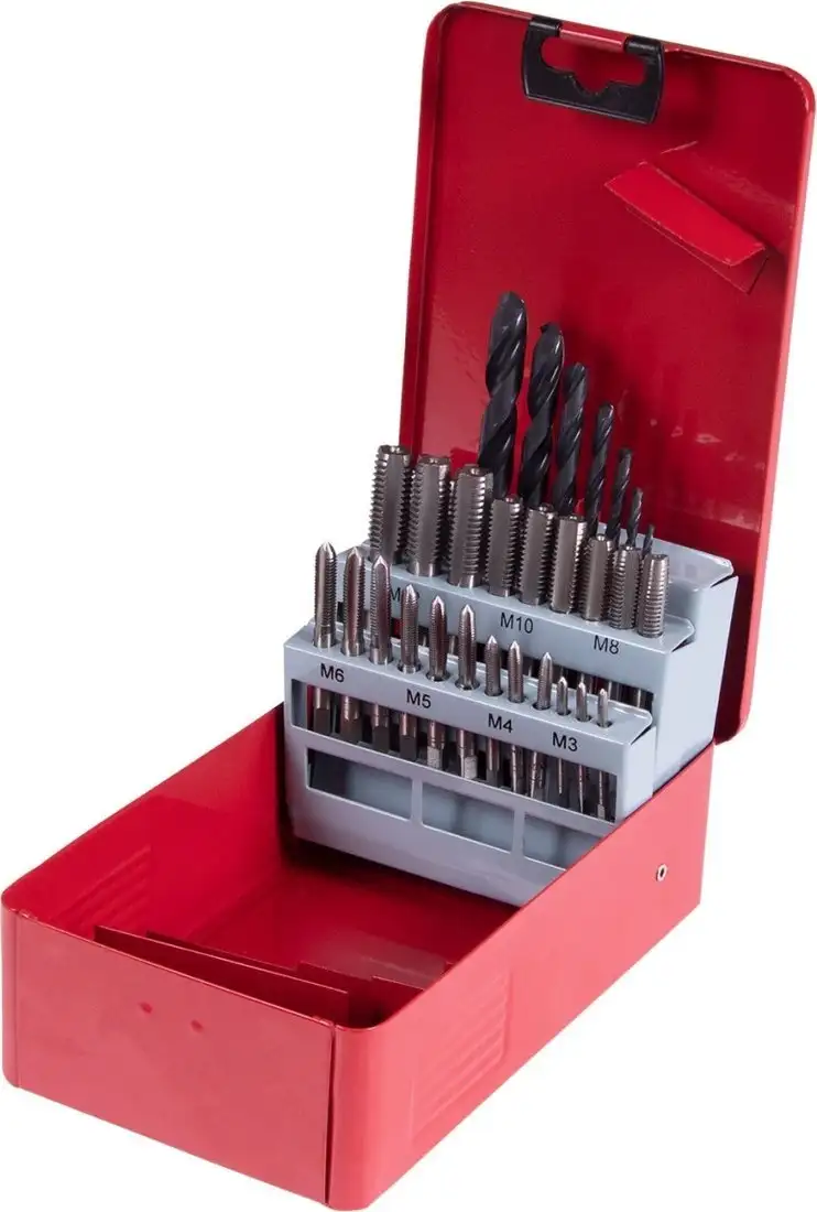 Этот набор метчиков King Tony 11328SQ включает 28 предметов, которые пригодятся для работы с металлом и ремонтов. В комплекте есть сверла разного размера — от 2,5 до 10,2 мм, а также метчики для нарезания резьбы в металлических деталях. Все инструменты выполнены без диэлектрической обработки, что подходит для использования с металлическими поверхностями. Набор не содержит торцевых головок и трещотки, изготовлен специально для резьбовых соединений и сверления металла. Он удобен в использовании благодаря разнообразию размеров и простоте хранения. Такой набор подойдет для домашнего мастера или специалиста, работающего с металлоконструкциями и мелким ремонтом.