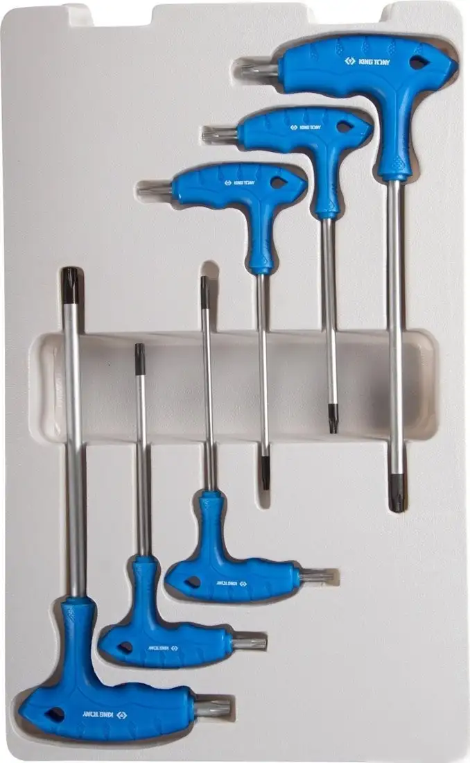 Этот набор ключей King Tony 22306TR включает 6 предметов разного размера — T10, T15, T20, T25, T30 и T40, что позволяет вам выполнять разные виды работ. В комплекте есть стандартные шестигранные ключи, которые подходят для монтажа и ремонта. Эти ключи не имеют диэлектрического покрытия, поэтому их лучше использовать для механических задач. Благодаря качественной обработке они долговечны и легко работают с винтами и гайками. В наборе нет дополнительных аксессуаров, таких как удлинители или головки для свечных клемм. Он подходит для домашнего использования, ремонта и обслуживания техники.