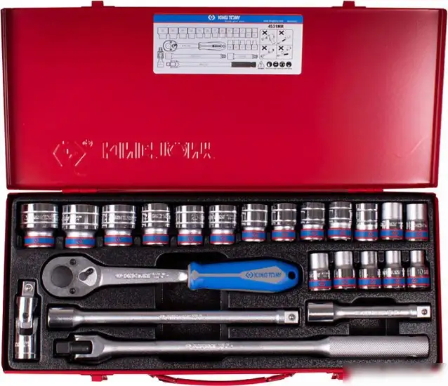 Универсальный набор инструментов King Tony 4531MR включает 23 предмета, предназначенных для разных ремонтных работ. В набор входят короткие головки с шестигранником разного размера (от 10 до 32 мм), что позволяет работать с различными деталями. В комплект входит флажковая трещотка с 32 зубцами и вороток с шарниром, что облегчает работу в труднодоступных местах. Также есть кардан и удлинители длиной 125 и 250 мм, которые помогают достичь скрытых болтов. Всё аккуратно упаковано в металлический кейс и ложемент из PVC, что удобно для хранения и переноски. Этот набор подходит как для домашних, так и для профессиональных нужд, обеспечивая надёжность и многофункциональность.
