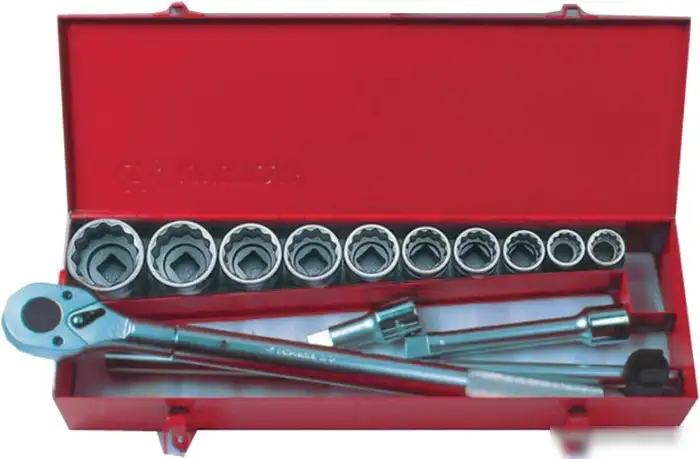 | Комплектация | - Головки торцевые стандартные двенадцатигранные, серии 6330M - 22, 24, 27, 30, 32, 36, 38, 41, 46, 50 мм; - Трещотка флажковая, серии 6779-20F - 24 зубца, длина 500 мм, съемная рукоятка; - Вороток скользящий, серии 6572-20 - длина 500 мм; - Удлинители серии 6251 - длина 200 и 400 мм; - Металлический кейс. |