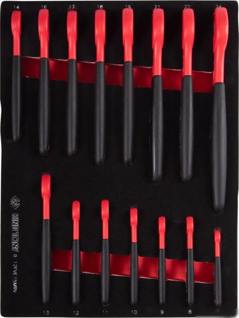 Этот набор ключей King Tony включает 15 диэлектрических рожковых ключей различных размеров от 7 до 24 мм, что удобно для работы с разными болтами и гайками. Все ключи выполнены из прочных материалов и защищены диэлектрическим покрытием, что увеличивает безопасность при работе с электрическими устройствами. В комплект входит легкий и прочный ложемент из EVA длиной 375 мм, который помогает хранить и быстро находить нужный инструмент. Набор не содержит торцевых головок и трещотки, но включает универсальные шестигранные биты и ключи, что расширяет возможности по закреплению и откручиванию различных элементов. Гибкие и удлинительные элементы позволяют добираться даже до труднодоступных мест. Использование этого набора помогает выполнять работы быстрее и безопаснее. Инструменты подходят для монтажа, ремонта и обслуживания различной техники и электроприборов. Компактный размер и эргономичные ручки делают работу комфортной и менее утомительной.