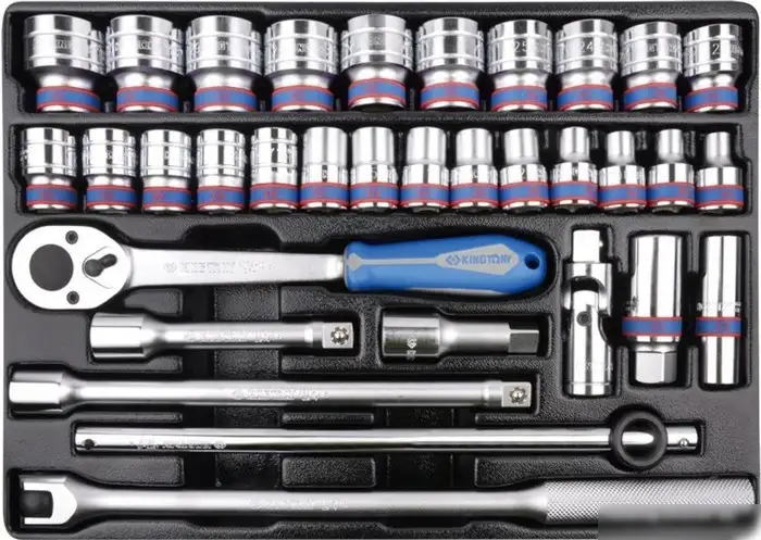 | Комплектация | - Головки торцевые стандартные шестигранные 1/2" KING TONY (4335M): 8, 9, 10, 11, 12, 13, 14, 15, 16, 17, 18, 19, 20, 21, 22, 23, 24, 25, 26, 27, 28, 29, 30, 32 мм; - Головка свечная шестигранная 1/2", 21 мм, L = 70 мм, резиновый фиксатор KING TONY 463521R; - Головка свечная шестигранная 1/2", 16 мм, L = 70 мм, резиновый фиксатор KING TONY 463516R; - Кардан 1/2" KING TONY 4791R; - Удлинитель 1/2", 75 мм KING TONY 4251-03R; - Удлинитель 1/2", 125 мм KING TONY 4251-05R; - Удлинитель 1/2", 250 мм KING TONY 4251-10R; - Трещотка 1/2", 250 мм, 32 зубца, флажковая, фиксатор KING TONY 4779-10GR; - Вороток 1/2", 380 мм, с шарниром KING TONY 4452-15FR; - Вороток 1/2", 300 мм, скользящий KING TONY 4572-12. - Ложемент |