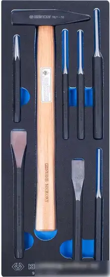 Этот набор выколоток King Tony 9-90118PRV включает в себя 8 предметов, которые полезны при работе с различными материалами. В комплект входят молоток с деревянной ручкой, кернеры, выколотки и зубила разных размеров. Все инструменты выполнены из прочных материалов и удобно лежат в EVA-ложементе размером 375 на 140 мм, что помогает удобно хранить и брать их с собой. Благодаря этому набору можно легко делать отверстия, отвёртывать детали или удалять лишний материал. Инструменты подходят для разнообразных задач и прослужат долго благодаря качественной сборке.