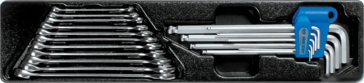 | Комплектация | Ключи комбинированные (1060) – 6, 7, 8, 9, 10, 11, 12, 13, 14, 15, 16 мм; Набор HEX L-типа с шаром (20109MR) – H1.5, H2, H2.5, H3, H4, H5, H6, H8, H10; Ложемент PVC 460?105 мм, №13 |