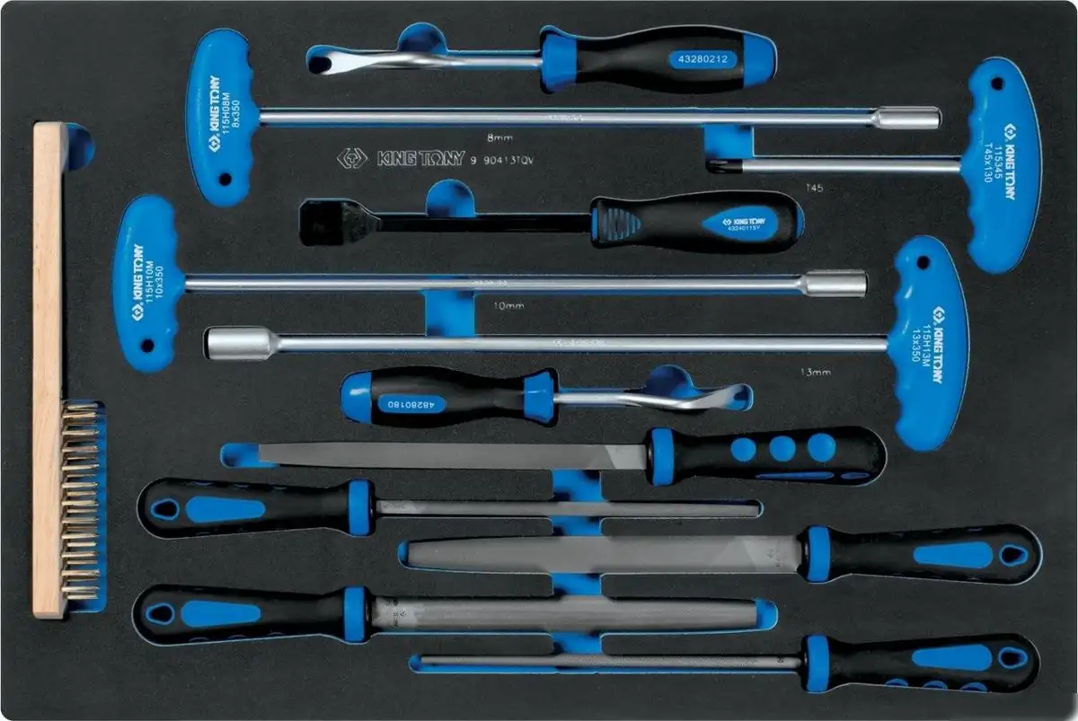 Этот набор напильников King Tony содержит 13 предметов, необходимых для точной обработки и ремонта. Он включает разные виды напильников – прямой, полукруглый, круглый, треугольный и квадратный – что позволяет выполнять разнообразные работы. В комплект также входят ключи торцевые Т-типа, съемники клипс и щетка металлическая, облегчая снятие уплотнителей и очистку. Все инструменты выполнены из прочных материалов и имеют удобные размеры для работы в труднодоступных местах. В комплекте есть ложемент из мягкого EVA, что обеспечивает удобство хранения и транспортировки. Некоторые инструменты, как торцевые ключи и отверточные биты, позволяют работать с разными крепежами. Устройство подходит как для профессиональных, так и для домашних мастеров. Оно помогает быстро и эффективно выполнять сложные задачи по ремонту и обслуживанию. Многофункциональность набора делает его удобным для различных видов работ, а качественная комплектация обеспечивает долговечность использования.