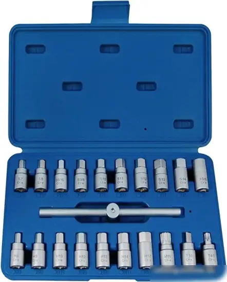 | Комплектация | - Шестигранник, мм: 8, 9, 10, 12, 13, 14, 17 - Внешний четырёхгранный профиль, дюйм, мм: 5/16", 3/8", 7, 8, 10, 11, 12, 13,14 - Профиль TORX: T45 - Внешний трёхгранный профиль, дюйм, мм: 10 - Профиль SPLINE: M16 - Внутренний четырёхгранный профиль, мм: 10 - Вороток Т-образный 3/8" - Кейс |