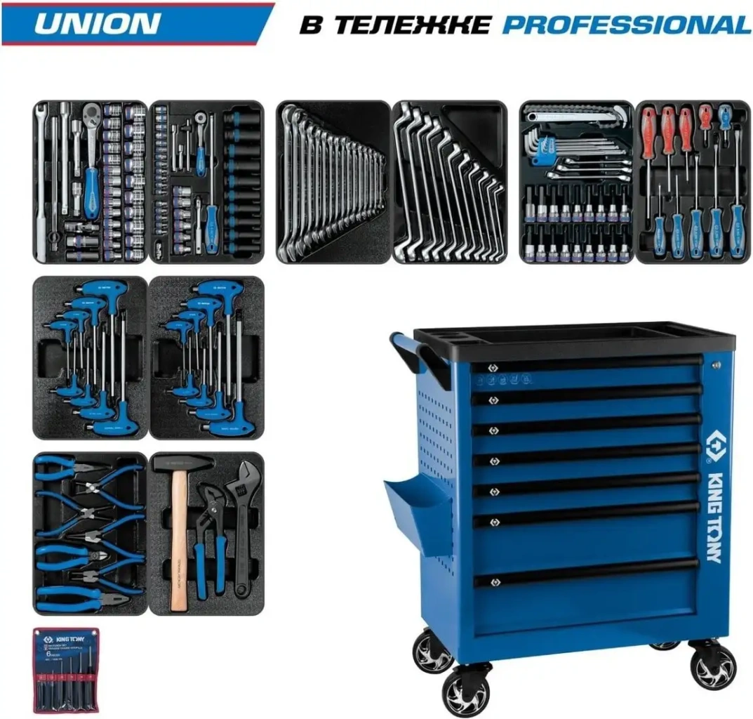 | Комплектация | 173 предмета / 10 ложементов / 5 модулей UNION • Модуль 1 9-4333MR03 (PVC 265?375 мм, №4) 1/2" Головки и принадлежности / 33 предмета Короткие 6-гранные (4335M) 8, 9, 10, 11, 12, 13, 14, 15, 16, 17, 18, 19, 20, 21, 22, 23, 24, 25, 26, 27, 28, 29, 30, 32 мм Свечные 12-гранные (4635R)16, 21 мм (резиновый фиксатор) Трещотка флажковая (4779-10GR)32 зубца, 262 мм Вороток с шарниром (4452-15FR)380 мм Вороток скользящий Т-типа (4572-12)300 мм Удлинители (4251R)75, 125, 250 мм Кардан (4791R)77,5 мм 9-7540MR (PVC 265?375 мм, №4) Головки и принадлежности / 40 предметов 1/2" Головки Е-стандарт Короткие (4375M) E10, E12, E14, E16, E18, E20 1/2" Головки ударные Глубокие 6-гранные (4435M) 10, 11, 12, 13, 14, 17, 19, 21, 22, 24 мм 1/4" Головки и принадлежности Короткие 6-гранные (2335M) 4, 4.5, 5, 5.5, 6, 7, 8, 9, 10, 11, 12, 13 мм Короткие Е-стандарт (2375M)E4, E5, E6, E7, E8 Трещотка дисковая (2755-55G)72 зубца, 144 мм Вороток с шарниром (2452-05F)130 мм Вороток скользящий Т-типа (2571-45)115 мм Отвёртка-вороток (2177DF)310 мм Удлинители (2221)50, 100 мм Кардан (2792)36 мм UNION • Модуль 2 9-1216MR03 (PVC 265?375 мм, №4) Ключи / 16 предметов Ключи комбинированные (1060) 8, 10, 11, 12, 13, 14, 15, 17, 18, 19, 21, 22 24, 27, 30, 32 мм 9-1711MR (PVC 265?375 мм, №4) Ключи / 11 предметов Ключи накидные 75° (1970) 6?7, 8?9, 10?11, 12?13, 14?15, 16?17, 18?19, 20?22, 21?23, 24?27, 30?32 мм UNION • Модуль 3 9-90131MR (PVC 265?375 мм, №4) Инструмент и оснастка / 31 предмет Съёмник масляных фильтров цепной (3204) 60-140 мм Набор HEX L-типа с шаром (20109MR)H1.5, H2, H2.5, H3, H4, H5, H6, H8, H10 Ключи разрезные (1930)10?11, 12?14, 14?17 мм Насадки торцевые 1/2" L=80 мм TORX (4033) T20, T25, T27, T30, T40, T45, T50, T55, T60HEX (4035)H4, H5, H6, H7, H8, H10, H12, H14, H17 9-31110MR (PVC 265?375 мм, №4) Отвёртки / 10 предметов PHILLIPS (1421) PH1?80, PH2?100, PH3?150, PH2?38 мм SLOTTED (1422)SL3.0?75, SL4.0?100, SL5.5?125, SL6.5?150, SL8.0?175, SL6.5?38 мм UNION • Модуль 4 9-22308TR (PVC 265?375 мм, №4) Ключи L-типа / 8 предметов TORX (1163TR) T10, T15, T20, T25, T30, T40, T45, T50 9-22108MR (PVC 265?375 мм, №4) Ключи L-типа / 8 предметов HEX (1160R) H2, H2.5, H3, H4, H5, H6, H8, H10 UNION • Модуль 5 9-40207GP (PVC 265?375 мм, №4) Шарнирно-губцевый инструмент / 7 предметов Пассатижи комбинированные (6111-08) 200 мм Пассатижи тонконосые (6311-06)160 мм Бокорезы диагональные (6211-06)160 мм Съёмники стопорных колец Внешних (разжим, загнутые) (68SB-07) 180 мм (европейский тип) Внутренних (сжим, загнутые) (68HB-07)180 мм (европейский тип) Внешних (разжим, прямые) (68SS-07)180 мм (европейский тип) Внутренних (сжим, прямые) (68HS-07)180 мм (европейский тип) 9-90103PP02 (PVC 265?375 мм, №4) Инструмент и оснастка / 3 предмета Ключ разводной Chrome (3611-12R) 0-35 мм, 300 мм Захват переставной (6511-10)250 мм Молоток, немецкий тип (7821-80)800 грамм 1006PR (виниловый чехол) Выколотки / 6 предметов Выколотка ? 2?30 мм (76402-45) 115 мм Выколотка ? 3?40 мм (76403-05)125 мм Выколотка ? 4?50 мм (76404-06)150 мм Выколотка ? 5?50 мм (76405-65)165 мм Выколотка ? 6?50 мм (76406-07)180 мм Выколотка ? 8?50 мм (76408-08)200 мм Свободный выдвижной ящик • 565?375?140 мм Свободный выдвижной ящик •565?375?140 мм |