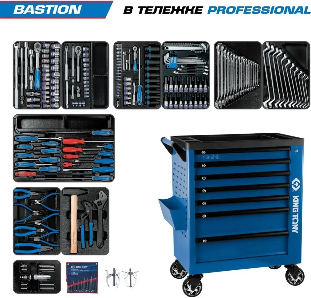 | Комплектация | 204 предмета / 10 ложементов / 6 модулей BASTION • Модуль 1 9-4333MR03 (PVC 265?375 мм, №4) 1/2" Головки и принадлежности / 33 предмета Короткие 6-гранные (4335M) 8, 9, 10, 11, 12, 13, 14, 15, 16, 17, 18, 19, 20, 21, 22, 23, 24, 25, 26, 27, 28, 29, 30, 32 мм Свечные 12-гранные (4635R)16, 21 мм (резиновый фиксатор) Трещотка флажковая (4779-10GR)32 зубца, 262 мм Вороток с шарниром (4452-15FR)380 мм Вороток скользящий Т-типа (4572-12)300 мм Удлинители (4251R)75, 125, 250 мм Кардан (4791R)77,5 мм 9-3523MR (PVC 265?375 мм, №4) 3/8" Головки и принадлежности / 23 предмета Короткие 6-гранные (3335M) 6, 7, 8, 9, 10, 11, 12, 13, 14, 15, 16, 17, 19, 20, 21, 22 мм Трещотка флажковая (3769-08F)32 зубца, 200 мм Вороток с шарниром (3452-10F)250 мм Вороток скользящий Т-типа (3571-08)200 мм Удлинители (3221)75, 150 мм Кардан (3792)56,5 мм BASTION • Модуль 2 9-7540MR (PVC 265?375 мм, №4) Головки и принадлежности / 40 предметов 1/2" Головки Е-стандарт Короткие (4375M) E10, E12, E14, E16, E18, E20 1/2" Головки ударные Глубокие 6-гранные (4435M) 10, 11, 12, 13, 14, 17, 19, 21, 22, 24 мм 1/4" Головки и принадлежности Короткие 6-гранные (2335M) 4, 4.5, 5, 5.5, 6, 7, 8, 9, 10, 11, 12, 13 мм Короткие Е-стандарт (2375M)E4, E5, E6, E7, E8 Трещотка дисковая (2755-55G)72 зубца, 144 мм Вороток с шарниром (2452-05F)130 мм Вороток скользящий Т-типа (2571-45)115 мм Отвёртка-вороток (2177DF)310 мм Удлинители (2221)50, 100 мм Кардан (2792)36 мм 9-90131MR (PVC 265?375 мм, №4) Инструмент и оснастка / 31 предмет Съёмник масляных фильтров цепной (3204) 60-140 мм Набор HEX L-типа с шаром (20109MR)H1.5, H2, H2.5, H3, H4, H5, H6, H8, H10 Ключи разрезные (1930)10?11, 12?14, 14?17 мм Насадки торцевые 1/2" L=80 мм TORX (4033) T20, T25, T27, T30, T40, T45, T50, T55, T60HEX (4035)H4, H5, H6, H7, H8, H10, H12, H14, H17 BASTION • Модуль 3 9-1216MR03 (PVC 265?375 мм, №4) Ключи / 16 предметов Ключи комбинированные (1060) 8, 10, 11, 12, 13, 14, 15, 17, 18, 19, 21, 22 24, 27, 30, 32 мм 9-1711MR (PVC 265?375 мм, №4) Ключи / 11 предметов Ключи накидные 75° (1970) 6?7, 8?9, 10?11, 12?13, 14?15, 16?17, 18?19, 20?22, 21?23, 24?27, 30?32 мм BASTION • Модуль 4 9-31919MR (PVC 560?375 мм, №6) Отвёртки и аксессуары / 19 предметов PHILLIPS (1411) PH0?75, PH2?38 мм PHILLIPS (1421)PH2?300 мм SLOTTED (1412)SL3.0?75, SL6.5?38 мм SLOTTED (1422)SL6.5?300 мм TORX TR (1427)T8H?75, T10H?75, T15H?75, T20H?100, T25H?100, T27H?100, T30H?125 мм PHILLIPS (1481) силовыеPH2?100, PH3?150 мм SLOTTED (1482) силовыеSL6.5?100, SL8.0?150 мм Съёмник клипс обшивки салона (43280212) Зев 8 мм, 120 мм Магнит гибкий (2121-18)? 5?565 мм BASTION • Модуль 5 9-40207GP (PVC 265?375 мм, №4) Шарнирно-губцевый инструмент / 7 предметов Пассатижи комбинированные (6111-08) 200 мм Пассатижи тонконосые (6311-06)160 мм Бокорезы диагональные (6211-06)160 мм Съёмники стопорных колец Внешних (разжим, загнутые) (68SB-07) 180 мм (европейский тип) Внутренних (сжим, загнутые) (68HB-07)180 мм (европейский тип) Внешних (разжим, прямые) (68SS-07)180 мм (европейский тип) Внутренних (сжим, прямые) (68HS-07)180 мм (европейский тип) 9-90103PP02 (PVC 265?375 мм, №4) Инструмент и оснастка / 3 предмета Ключ разводной Chrome (3611-12R) 0-35 мм, 300 мм Захват переставной (6511-10)250 мм Молоток, немецкий тип (7821-80)800 грамм BASTION • Модуль 6 9-4128FR (PVC 265?185 мм, №5) Набор демонтажный / 10 предметов Отвёртка ударная (4112) Посадочный квадрат 1/2"Держатель вставок (бит) 5/16" (414810S)Посадочный квадрат 1/2" Вставки (биты) 5/16" PHILLIPS L=36 мм (1836P) PH2, PH3PHILLIPS L=80 мм (1880P)PH2, PH3 SLOTTED L=36 мм (1836S)SL9.0?1.6, SL11.0?2.0 SLOTTED L=80 мм (1880S)SL8.0?1.2, SL10.0?1.6 Вспомогательный инструмент Съёмники подшипников / 2 предмета 3-захватный (7963-04) 100 мм2-захватный (7962-04)100 мм |