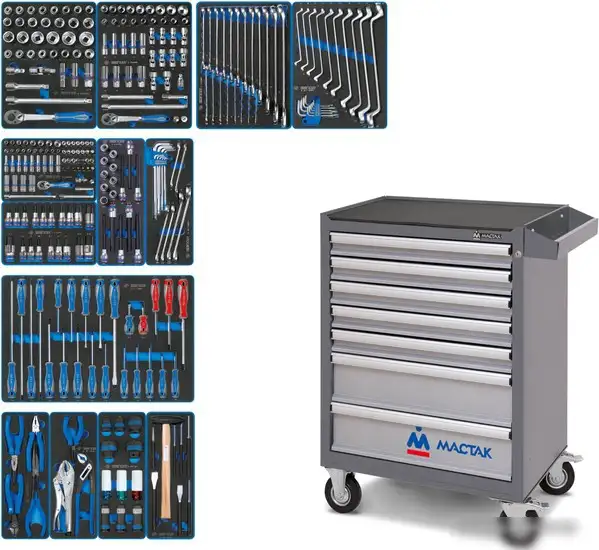 - Тележка с 7 выдвижными полками — удобно организует инструменты.