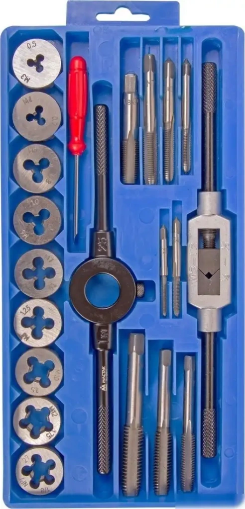 | Комплектация | Метчики и плашки - 18 шт: M3?0.5, M4?0.7, M5?0.8, M6?1.0, M7?1.0, M8?1.25, M10?1.5, M12?1.75, 1/8NPT27; Метчикодержатель - 1 шт; Плашкодержатель 25 мм - 1 шт; Отвертка шлицевая - 1 шт. |