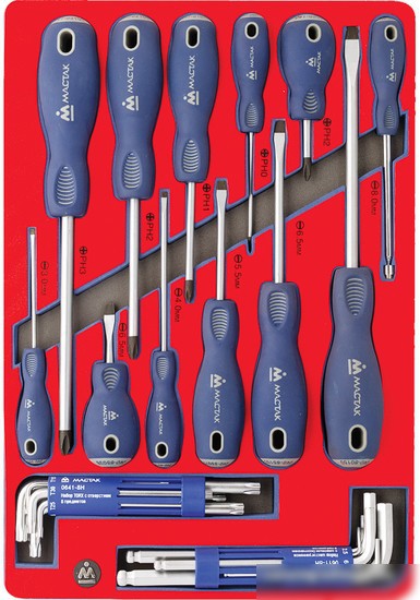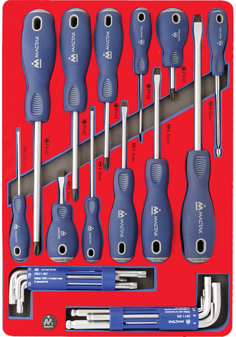 | Комплектация | - Отвертки шлицевые: 3х75, 4х100, 5.5х75, 6.5х38, 6.5х100, 8х150 мм - Отвертки крестовые: 0х75, 1х75, 2х38, 2х100, 3х150 мм - Шестигранники Г-образные длинные с шаровым окончанием: 2, 2.5, 3, 4, 5, 6, 8, 10 мм - TORX Г-образные длинные с отверстием: Т10, Т15, Т20, Т25, Т30, Т40, Т45, Т50 - Телескопический магнитный извлекатель, длина макс. 450 мм |