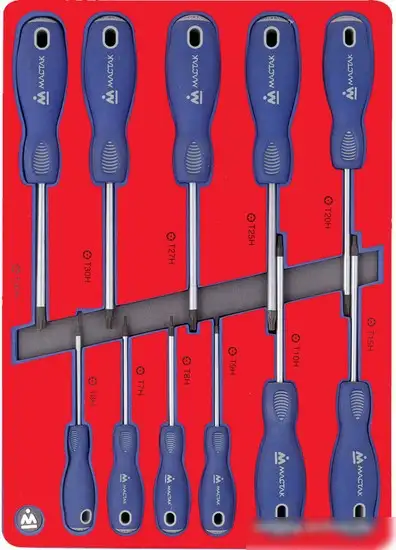| Комплектация | • Отвертки TORX с двухкомпонентной эргономичной ручкой. Размеры: Т6х75, Т7х75, Т8х75, Т9х75, Т10х100, Т15х100, Т20х100, Т25х100, Т27х100, Т30х100, Т40х100. |