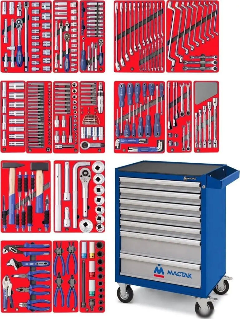Универсальный набор инструментов Мастак 52-07323B включает 323 предмета, поэтому вы найдете всё необходимое для ремонта и обслуживания. В наборе есть торцевые, глубокие и Е-тип головки различных размеров, которые позволяют работать с разным крепежом. Также он содержит комбинированные, накидные и шестигранные ключи, а также отвертки и насадки, что делает работу более удобной и быстрой. В комплект входят трещотки, гибкие удлинители, воротки и адаптеры, повышающие функциональность инструментария. Набор включает съемники, шарнирно-губцевый и демонтажный инструменты для сложных задач. Все инструменты изготовлены из прочных материалов и оформлены в удобную цветовую гамму — серый и синий. Вы не потеряете время, и легко найдете нужный инструмент благодаря хорошо организованной комплектации. Специальные функции, такие как наличие глубоких головок и удлинителей, делают работу намного проще и эффективнее. Это надежное решение для домашнего и профессионального использования, обеспечивающее долговечность и удобство в эксплуатации.