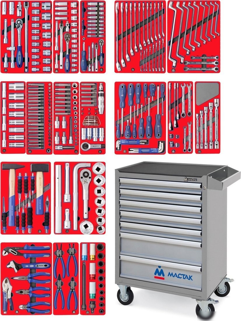 | Комплектация | 1/2" Головки и принадлежности / 28 предметов; 3/8" Головки и принадлежности / 22 предмета; 1/4" Головки и принадлежности / 45 предметов; Ключи комбинированные / 20 предметов; Ключи накидные / 12 предметов; Глубокие 6-гранные головки / 12 предметов; Вставки (биты) 10 мм и принадлежности / 40 предметов; Спецголовки и насадки / 28 предметов; Набор демонтажный / 24 предмета; Отвёртки, ключи L-типа, магнит / 28 предметов; Ключи трещоточные / 11 предметов; Ключи шарнирные / 5 предметов; Ударно-режущий инструмент / 10 предметов; 3/4" Головки и принадлежности / 13 предметов; Шарнирно-губцевый инструмент / 6 предметов; Съёмники стопорных колец / 4 предмета; 1/2" Головки и принадлежности ударные / 16 предметов |