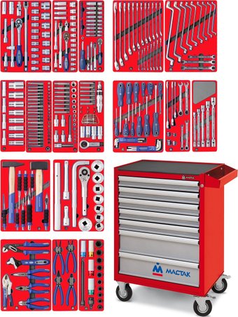 | Комплектация | 1/2" Головки и принадлежности (28 предметов); 3/8" Головки и принадлежности (22 предмета); 1/4" Головки и принадлежности (45 предметов); Ключи комбинированные (20 предметов); Ключи накидные (12 предметов); Глубокие 6-гранные головки (12 предметов); Вставки (биты) (40 предметов); Спецголовки и насадки (28 предметов); Набор демонтажный (24 предмета); Отвёртки, ключи L-типа, магнит (28 предметов); Ключи трещоточные (11 предметов); Ударно-режущий инструмент (10 предметов); 3/4" Головки и принадлежности (13 предметов); Шарнирно-губцевый инструмент (6 предметов); Съёмники стопорных колец (4 предмета); 1/2" Головки и принадлежности ударные (16 предметов) |