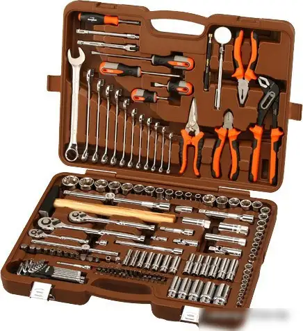 Этот универсальный набор инструментов Ombra OMT150S включает в себя 150 предметов, необходимых для ремонта и обслуживания. В набор входят торцевые головки разного размера для работы с болтами и гайками, а также длинные головки для труднодоступных мест. Там есть трещотка, гибкий удлинитель и адаптер для бит, что делает работу удобнее. В комплект также входят ключи, плоскогубцы, пассатижи, молоток, ножницы и отвертки, что позволяет выполнить широкий спектр задач.