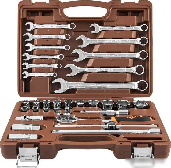 Этот универсальный набор инструментов Ombra OMT33S включает 33 предмета, которые понадобятся для ремонта и сборки домашних и автомобильных вещей. В комплект входят торцевые головки, ключи, трещотка и удлинители, что позволяет легко работать с разными видами крепежа. Все инструменты выполнены в приятных цветах — черном, оранжевом и серебристом, что помогает быстро найти нужный в наборе. Благодаря разнообразию предметов, вы можете легко затягивать и откручивать гайки и болты разных размеров. В наборе есть все необходимые инструменты для работы с автомобилями, мебелью и бытовой техникой. Удобные удлинители и кардан позволяют добираться до труднодоступных мест, а прочные материалы обеспечивают долгий срок службы. Этот набор станет отличным помощником для домашнего мастера или профессионала.